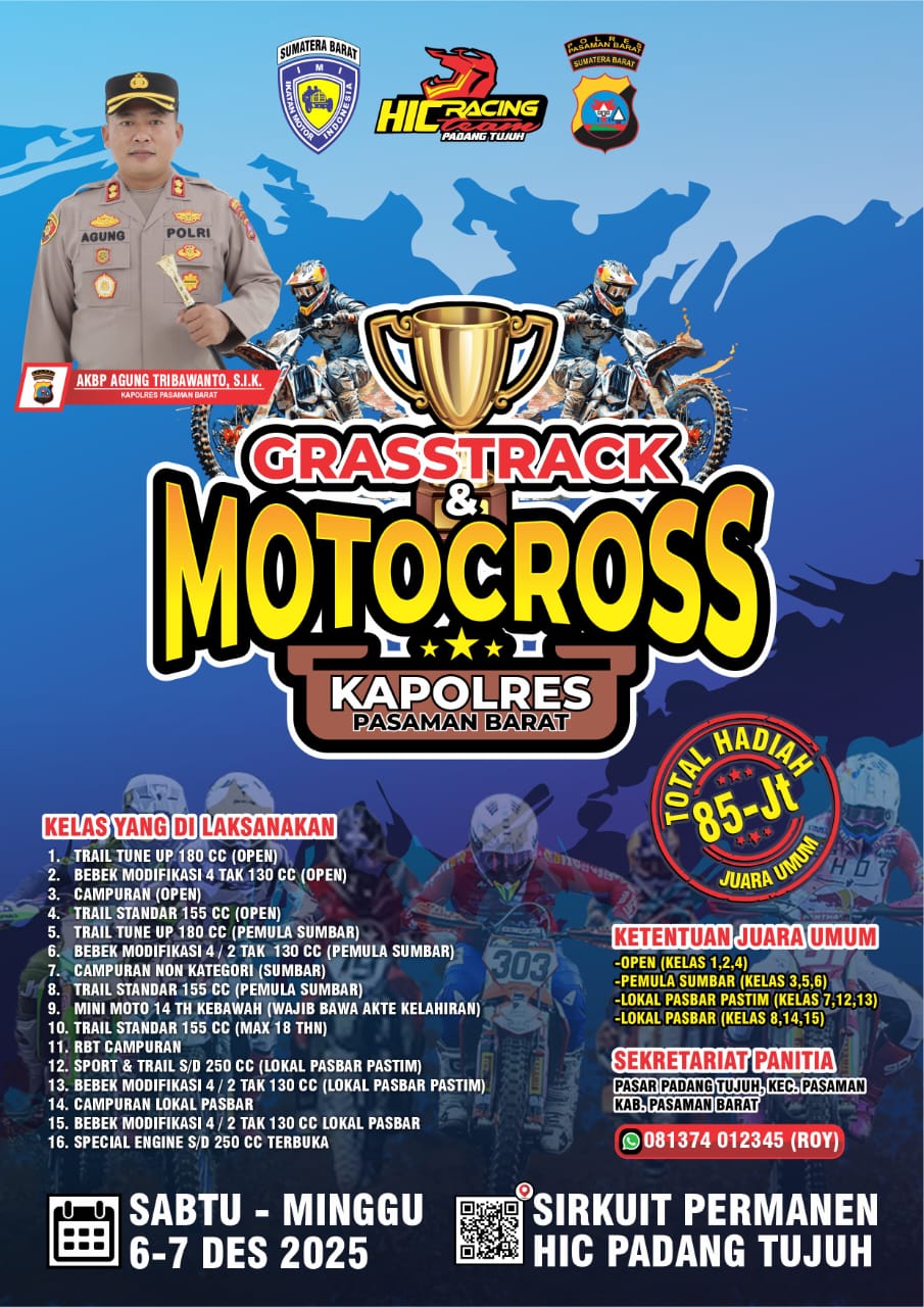 Grasstrack & Motocross Kapolres Cup 2025 ini dipastikan menjadi agenda otomotif terbesar di akhir tahun di wilayah barat Sumatera Barat.
