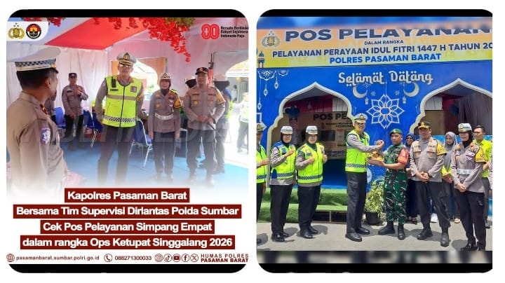 Pasaman Barat | Dalam rangka memastikan kesiapan pengamanan dan pelayanan kepada masyarakat selama arus mudik dan balik Lebaran 1447 Hijriah, Kapolres Pasaman Barat AKBP Agung Tribawanto turun langsung meninjau Pos Pelayanan Simpang Empat yang menjadi salah satu titik penting dalam pelaksanaan Operasi Ketupat Singgalang 2026.